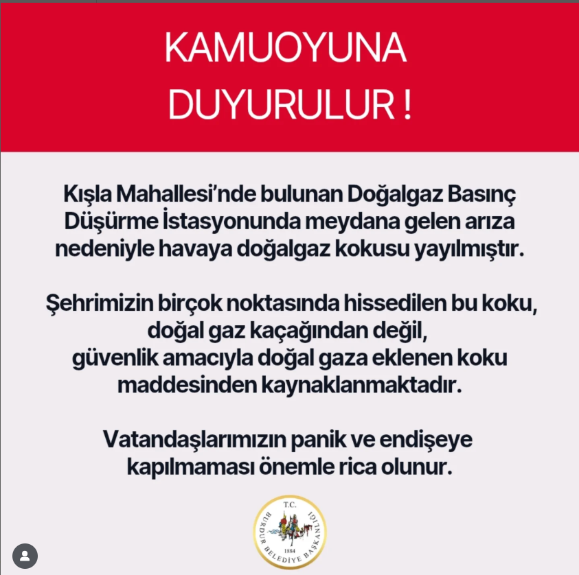 Belediyeden yapılan açıklamada, şehirde hissedilen kokunun doğalgaz kaçağından kaynaklanmadığı belirtildi. Açıklamada, “Kokunun nedeni, güvenlik amacıyla doğalgaza eklenen ve sızıntıları tespit etmeye yarayan koku maddesidir. Herhangi bir tehlike söz konusu değildir” denildi.