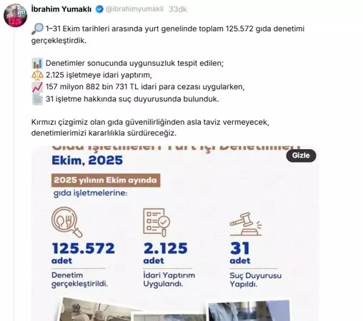 Bakan Yumaklı, sosyal medya hesabından yaptığı paylaşımda, vatandaşların güvenilir gıdaya ulaşması için denetim faaliyetlerinin aralıksız sürdüğünü belirtti.