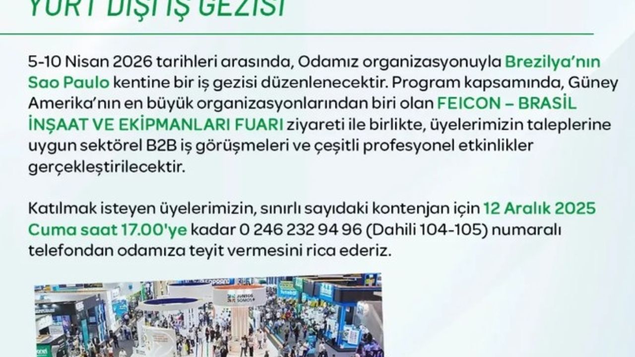 Isparta Ticaret ve Sanayi Odası (ITSO), 5–10 Nisan 2026 tarihleri arasında Brezilya’nın Sao Paulo kentine yönelik bir iş gezisi düzenleyeceğini duyurdu. Program kapsamında, Güney Amerika’nın en büyük organizasyonlarından biri olarak kabul edilen FEICON – Brasil İnşaat ve Ekipmanları Fuarı ziyaret edilecek.