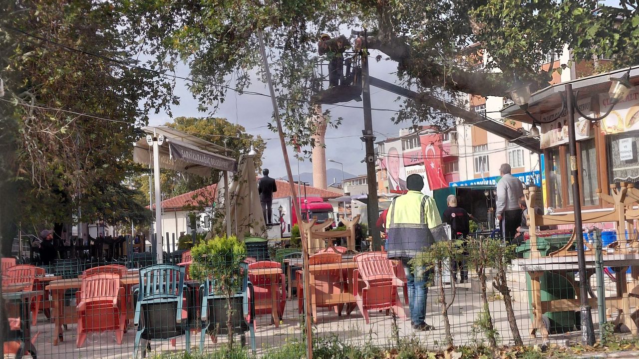 Şarkikaraağaç Belediye binası karşısında bulunan çınar ağacında kış mevsimi öncesi güvenlik ve çevre düzeni amacıyla budama ve temizlik çalışması gerçekleştirildi.