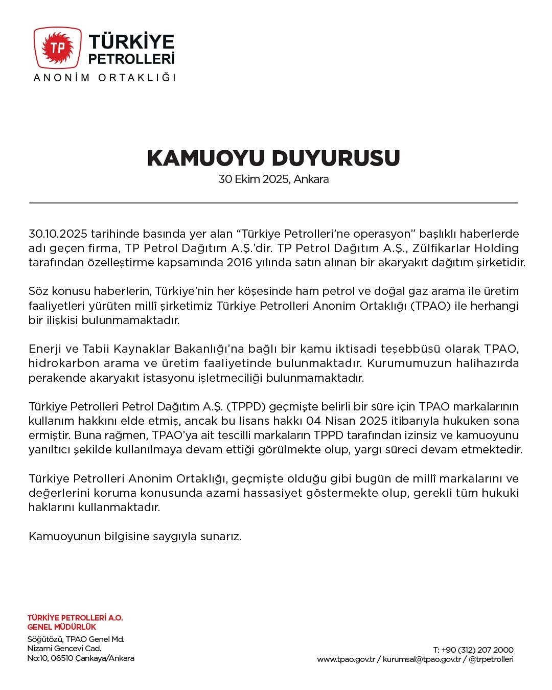“Bazı basın yayın organlarında ‘Türkiye Petrolleri’ adı kullanılarak yer alan haberlerde, şirketimizin adıyla karışıklık yaşandığı görülmektedir. Haberlere konu olan firma, Türkiye Petrolleri Anonim Ortaklığı (TPAO) değil, Zülfikar Holding’e bağlı TP Petrol Dağıtım A.Ş.’dir. TPAO’nun bu olayla herhangi bir ilgisi bulunmamaktadır.”